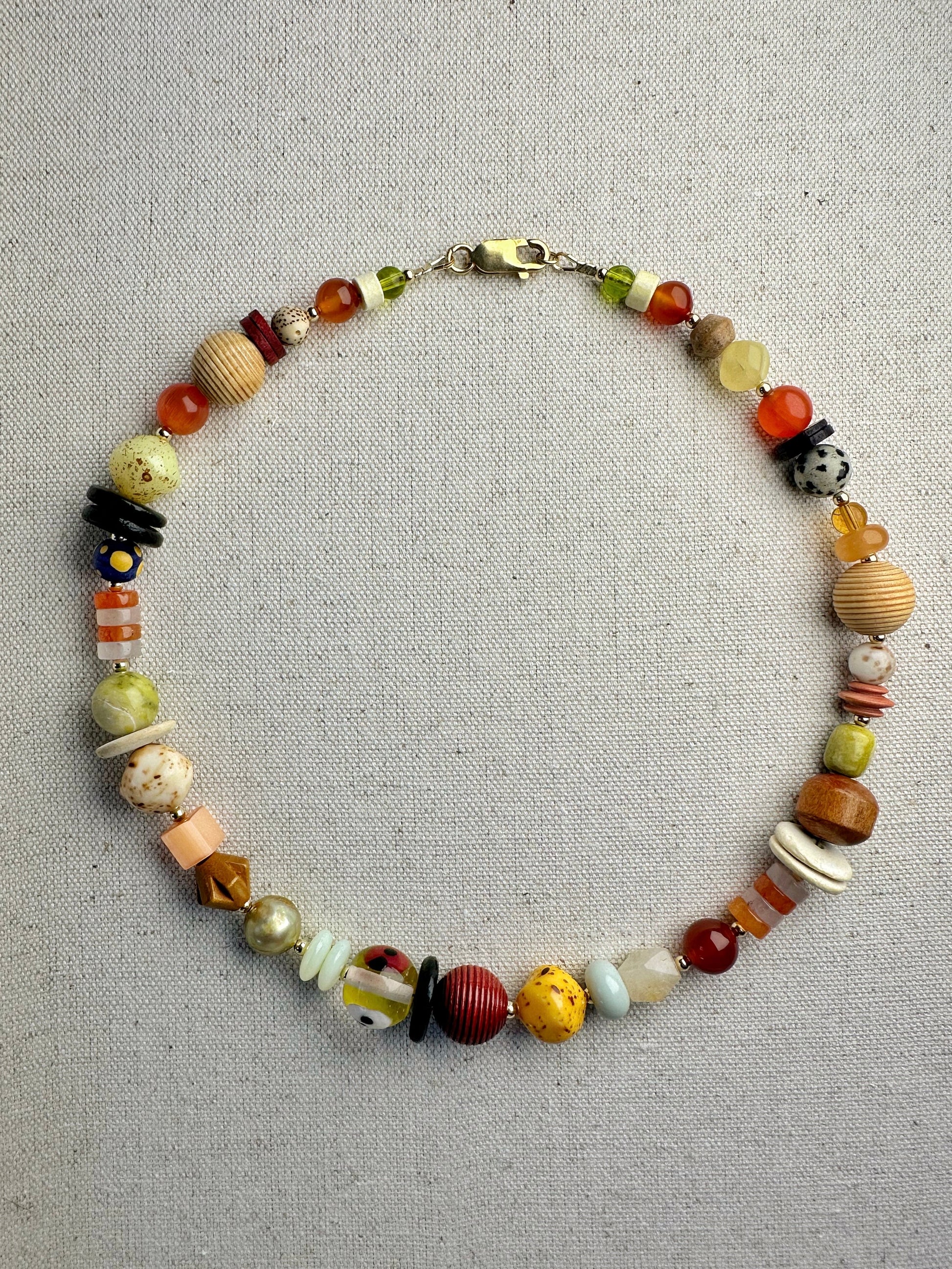 Fika is colourful, textural and more-ish — a token of joy as the days get darker and gloomier. A curation of 31 stone, wood, glass and natural pearl beads, collected from different corners of the world, and hand-strung in London.