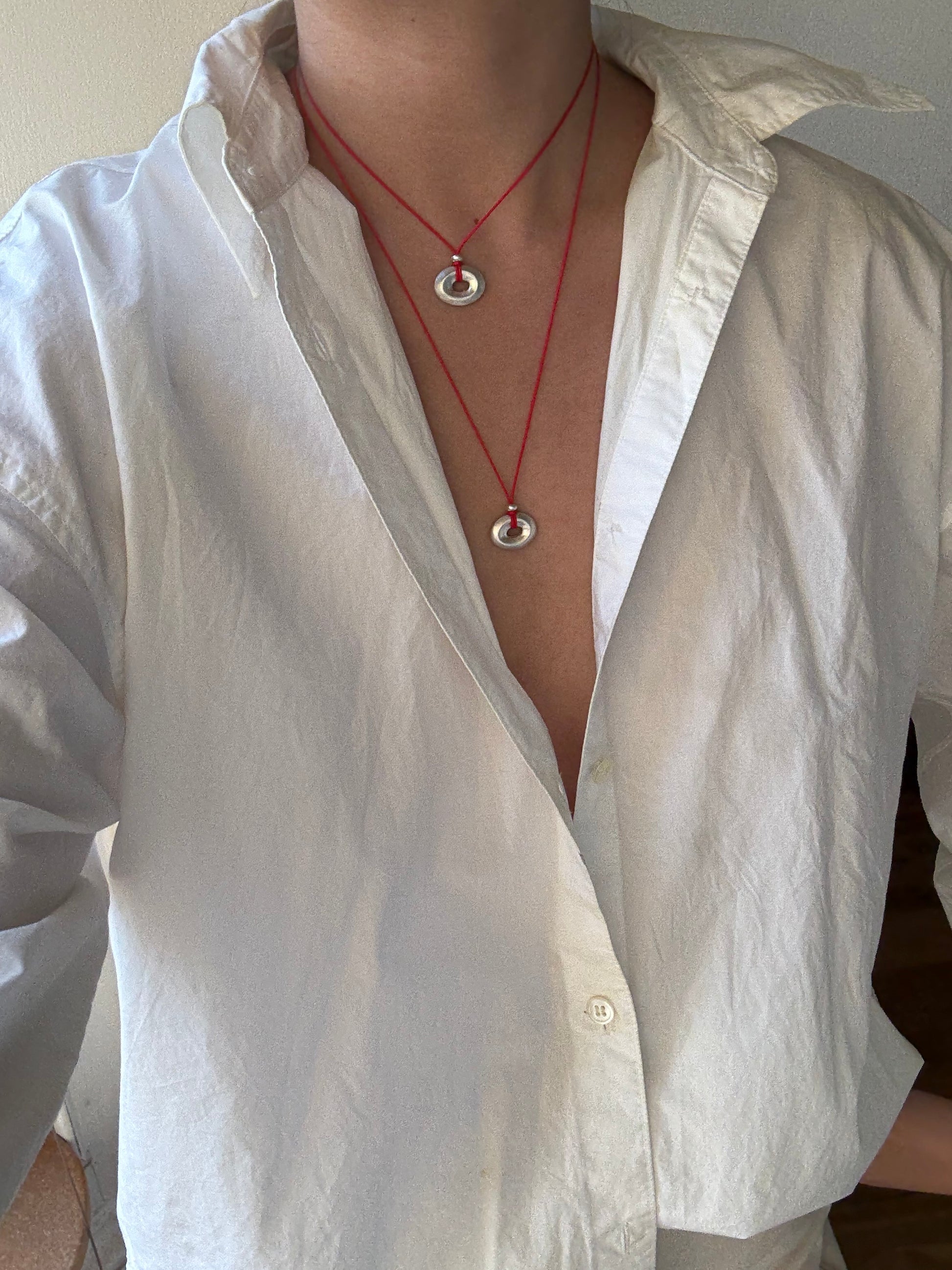 A play on the 'lucky jade' charm. Designed to evoke a similar sense of intimacy and comfort. Softly sloped silver, hand-wrought and strung on traditional lucky red thread.
