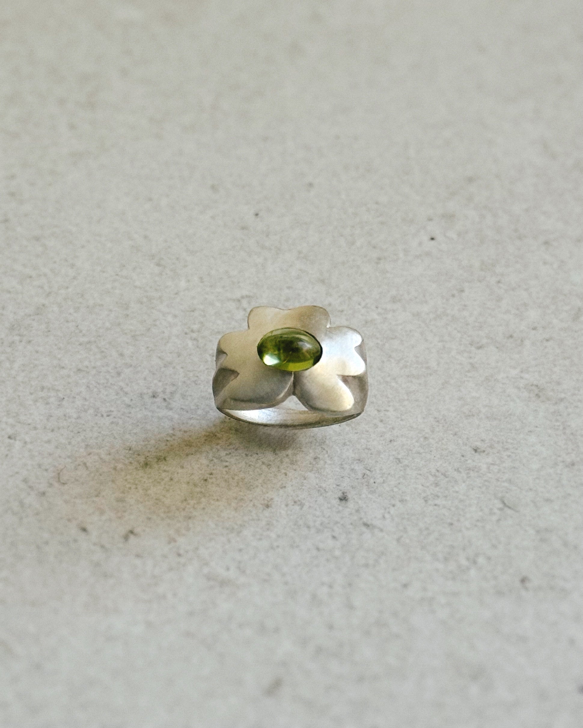Hand-carved sterling silver signet set with a soft green Peridot stone. Colour somewhere between olive and pear. Suitable as a pinky ring, but wear on any finger of your choosing.